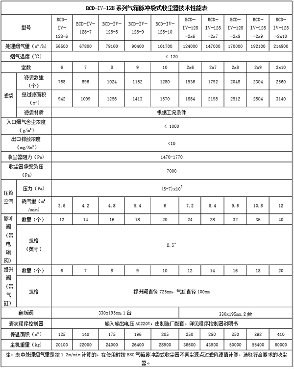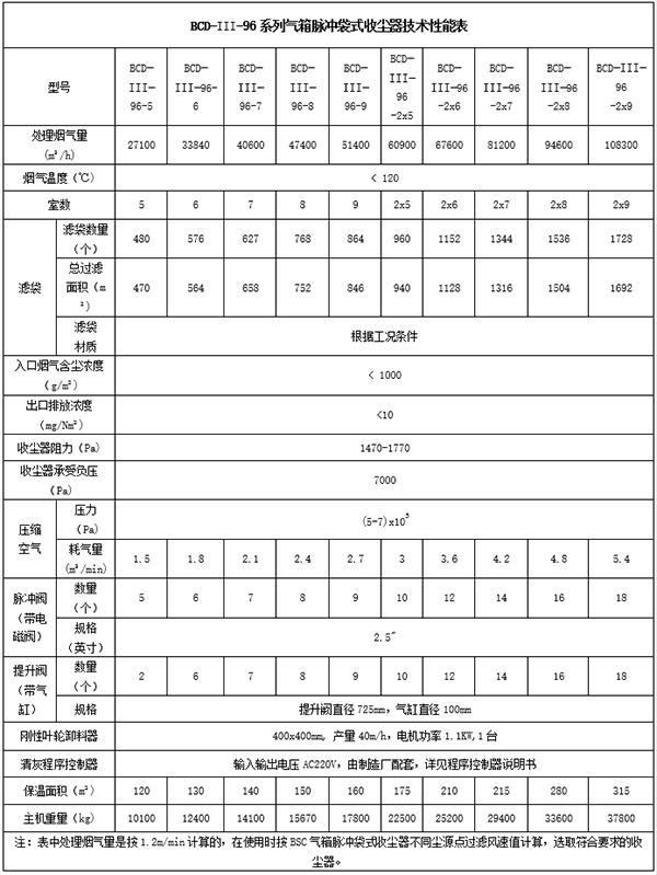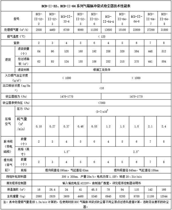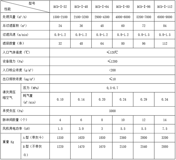 BCD系列脉冲单机除尘器主要性能表