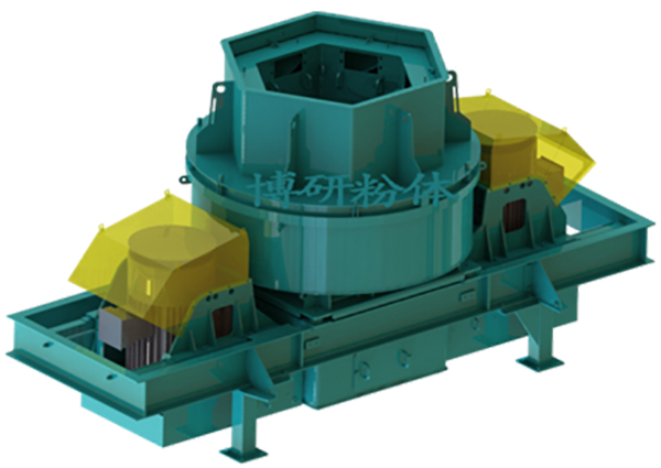 立轴冲击式制砂机主要由机架、传动装置、液压缸、分料盘、破碎腔、平台等部分组成。工作时物料由机器上部入口垂直落入高速旋转的叶轮内,在高速离心力的作用下,与另一部分以伞状形式分流在叶轮四周的物料产生高速撞击并粉碎,物料在互相撞击后,又会在叶轮和机壳之间形成涡流,再次的互相撞击、摩擦和粉碎后从下部直通排出。